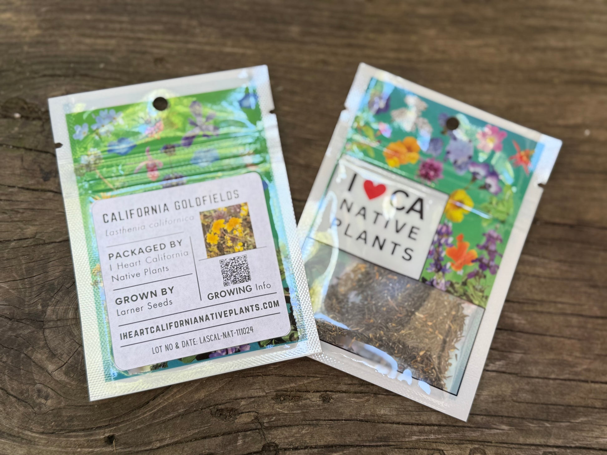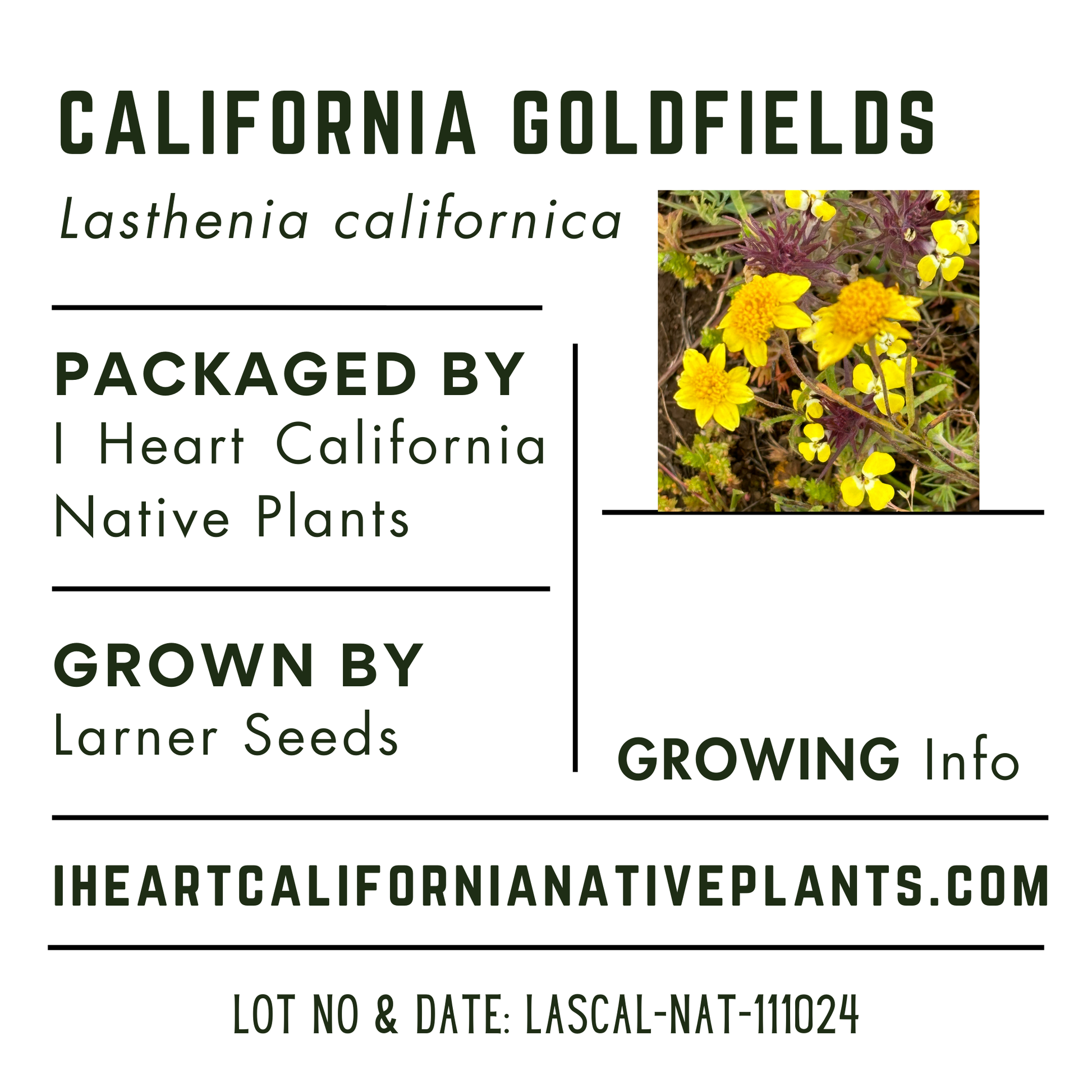 California Goldfields (Lasthenia californica) is a widespread species of flowering plant in the Asteraceae (Sunflower) family, among a number of species in the genus Lasthenia, all known by the common name goldfields. This species is native to a large part of California, Oregon, and surrounding areas, where it is a very common member of the flora in a number of habitat types. This is an annual herb is quite variable in appearance across locations and climates. The leaves are hairy, somewhat linear in shape. Individuals growing along the coast may have fleshy leaves. Atop the hairy stems are flower clusters of flower heads with hairy phyllaries (leaf-like structures at the base of the flower). The head contains many yellow disc florets with a fringe of small ray florets. Large populations of this species bloom at one time in the spring, producing the carpets of yellow on hillsides and in meadows that give the plant its common name. In the garden, it is most often grown from seed, which germinates readily. From Calscape.
