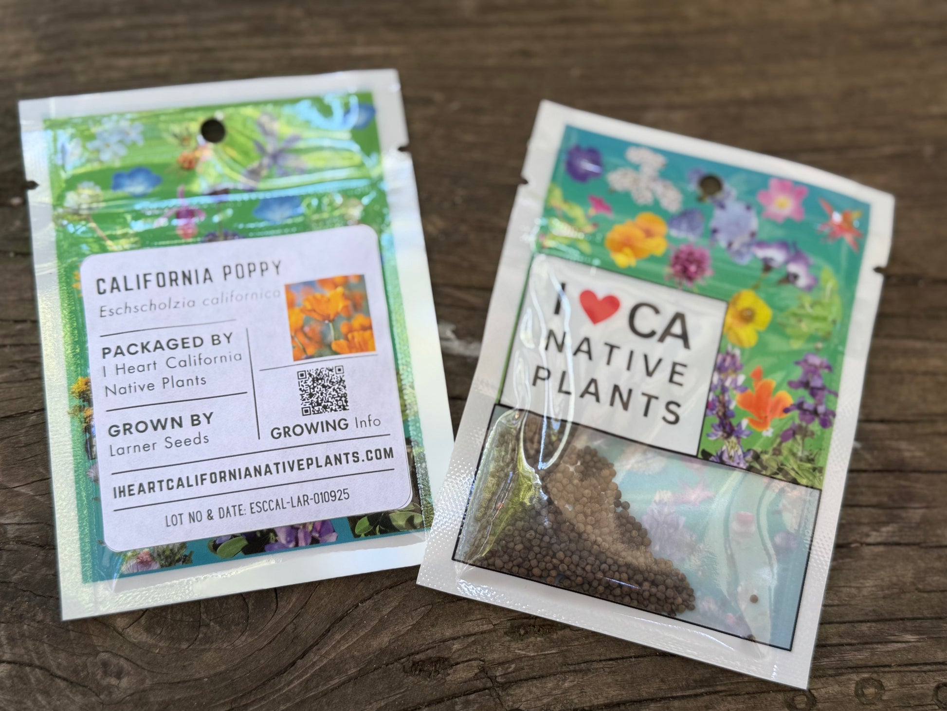 The California poppy (Eschscholzia californica) is the state flower of California. Every garden can find a place for this easy, cheerful annual. It self-seeds freely and will give your whole neighborhood poppies, but is not particularly invasive. The plant grows in full sun but will tolerate part shade. It reaches one to two foot tall and can be perennial in milder areas. The feathery foliage is blue-green The flowers range from yellow to bright orange, appearing from February to September, though primarily in spring. The petals may remain closed in cloudy weather. The fruit is a slender capsule which splits to release numerous small black or dark brown seeds. The seeds are ready to take when the pods become dry and brown. Birds, butterflies, bees and other pollinators are attracted to this plant. Rabbits may browse the leaves but it is deer resistant. It is best introduced into the garden from seed sown in fall at the start of the rainy season. Do not cover the seeds with soil or mulch. California poppies like fast draining soil and plenty of sunshine but are very hardy and will also thrive in poor soil conditions, such as clay. If planting from seedlings, be careful with the long sensitive roots and water occasionally until established. From Calscape.