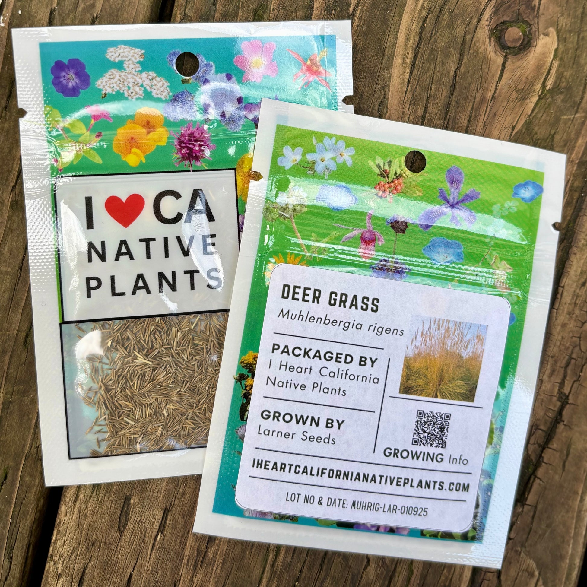 This native bunchgrass, Deergrass (Muhlenbergia rigens) is a popular plant choice for groundcover and lawn replacement applications. It's an attractive, low-water grass that's very easy to grow. Deergrass does best in sandy soil and full sun, but it is versatile enough to tolerate shade and a variety of soil types. The leaf blades are pale green, and in spring the plant produces tall spikes of yellow flowers. The seeds provide food for birds in summer. Plant this large mounding grass in groups for an impressive display. From Calscape.